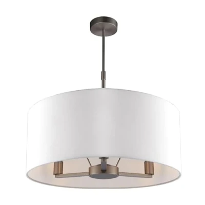 The 3 light pendant is finished in matt nickel with a large vintage white faux silk shade. This fitting has an adjustable drop, is dimmable and suitable for use with LED lamps. Other ceiling options also available