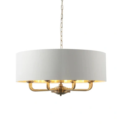 The Highclere pendant is a sophisticated mix of vintage white fabric shade lined with gold metallic inner and antique brass plated metalwork. This statement light is the perfect timeless addition to modern and classic homes of today.