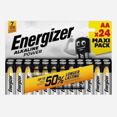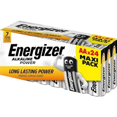 General description Pack of 24 Energizer® AA Cell Alkaline Power Batteries. Energizer® Alkaline Power Batteries provide affordable and extremely reliable power, making them a great choice for various devices. Technical specifications Type: AA Cell Alkaline Pack size: 24 batteries Leakage protection: Yes Power retention: Up to 7 years Usage Ideal for large torches Wireless gaming controllers Headsets Cameras Remote controls Walkie-talkies And much more