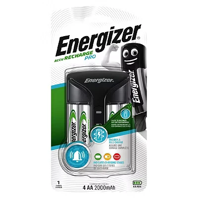 General description The Energizer 639838 Pro Battery Charger is a high-performance universal charger designed to recharge four AA, AAA, C, D size batteries, or two 9.0V batteries simultaneously. It features audio and visual alerts to indicate the charging status and includes four 2000 mAh AA rechargeable batteries. Technical specifications Battery Size: AA, AAA Charging time: approximately 3 hours for AA or AAA batteries Dimensions (W x D x H): 50 x 70 x 116 mm MPN: PROCHARGER EAN: 7638900398380 Compatibility and accessories Compatible with AA and AAA rechargeable batteries Includes 4 x AA 2000 mAh rechargeable batteries No additional accessories required Installation Insert the batteries into the designated slots in the charger, ensuring correct polarity Connect the charger to a power outlet to start charging Usage Monitor the charging process via the audio and visual indicators Remove batteries once fully charged to maximize battery lifespan Other information LED indicators to