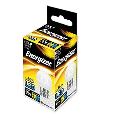 General description These Opal Finish Energizer LED Golf Bulbs replicate traditional halogen bulbs in appearance and output while offering an 85% energy saving compared to their halogen equivalents. The bulbs feature a true retro fit design, providing instant, flicker-free light with an average rated life of up to 25,000 hours. Technical specifications Fitting: ES (E27) Input Wattage: 5.2W (40W equivalent) Lumens of Light: 470 lm Switching Cycles: 40,000 Average Rated Life: 15,000 hours Colour Temperature: 2,700K (Warm White) Lamp Dimensions: 45 x 87 mm Dimmable: No Energy Class: A+ Voltage: 220-240V / 50Hz Beam Angle: 160° Compatibility and accessories Compatible with standard E27 screw fixtures Suitable for use in ceiling fixtures, lamps, and decorative lighting Installation Install by screwing the bulb into a compatible E27 socket Ensure the power is turned off before installation Usage Ideal for general lighting in homes, offices, and commercial spaces Provides warm, inviting