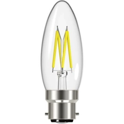 General description This LED BC (B22) Candle Filament Non-Dimmable Bulb features a decorative filament that replicates the appearance of traditional halogen bulbs while providing significant energy savings. With a warm white light output of 470 lumens, it creates a cozy ambiance and offers instant, flicker-free illumination. Designed as a true retrofit, this bulb is compatible with standard fittings and has an impressive average lifespan of 15,000 hours. Technical specifications Fitting: BC (B22) Input Wattage: 4W (40W equivalent) Lumens of Light: 470 lm Colour Temperature: 2,700K (Warm White) Switching Cycles: 40,000 Average Rated Life: 15,000 hours Lamp Dimensions: 35 x 98 mm Dimmable: No Energy efficiency class: A+ Compatibility and accessories Compatible with standard BC (B22) light fittings Installation Simply screw the bulb into compatible B22 sockets for immediate use. Usage Ideal for decorative lighting in homes, cafes, or restaurants Suitable for chandeliers, wall sconces,