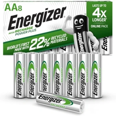 8 pack of Energizer Accu Recharge Power Plus AA batteries Long Lasting: Energizer rechargeable batteries AA last up to 4x longer (may vary by device) than Energizer basic alkaline in digital cameras; take up to 349 photos per one full charge, dependent on camera and usage Trusted Power: Double A batteries for cameras, doorbells, remotes, torches and more of your everyday devices Leak Protection: Rechargeable Energizer batteries are designed to protect your essential devices from damaging leaks under normal use conditions Energizer Innovation: The world’s first rechargeable AA battery made with 22% recycled materials Rechargeable: Each AA battery can be charged hundreds of times, with one charge lasting up to 12 months in storage Customers’ Choice: Energizer is the world’s no.1 rechargeable brand, based on scan sales
