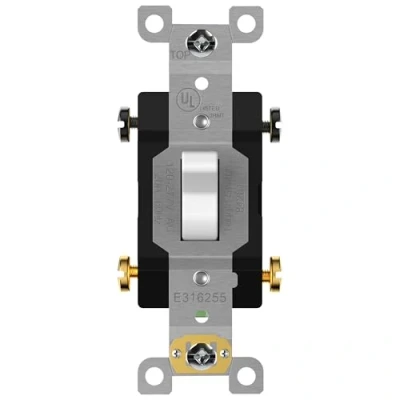 Commercial grade ON/OFF 4-way toggle switch with shallow body design to fit standard junction boxes; replaces any 1-gang wall switch for use in 4-way configurations; push-in and side wiring (copper only); break-off plaster ears Made from impact-resistant Polycarbonate Thermoplastic with solid steel components; frame dimensions: 3.65” H x 1.30” W x 0.90” D Suitable for commercial locations such as offices, schools, stores, shops, restaurants, public facilities, and hotels, as well as residential areas that require 20A switches For the best fit and color match, always use ENERLITES wall plates such as the 8811-W, 8811M-W, or 8811O-W toggle switch covers White; 20A, 120V/277 VAC, 4-way use only; option of back wiring (#10-#14 AWG) or side wiring (#12-#14 AWG); self-grounding; break-off plaster yoke tabs; wiring instructions included; UL-listed; 1-year warranty