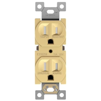 Superior design tamper-resistant duplex outlet from our Elite Series; replaces any 1-gang in-wall electrical outlet; receptacle face has a soft metallic-colored finish; suitable for residential locations such as homes, apartments, and condominiums, as well as commercial locations that only require a 15A outlet, such as corporate buildings, hotels, and restaurants Child safe tamper-resistant duplex receptacle increases safety by preventing unwanted objects from being inserted; complies with 2017 NEC Article 406.12 Self-grounding for easy installation; shallow body design fits standard junction boxes; dimensions: 4.09” height x 1.31” length x 1.10” depth; wiring method choice of back insert or side screw terminals; break-off plaster ears for easy positioning and firm attachment; installation instructions included Durable construction made from high-quality, impact-resistant Polycarbonate Thermoplastic material for long service life Gold color; includes installation screws; 15A 125VAC, 5-15R; flammability UL94, V2 Rating; UL Listed; 1-year warranty, Manufacturer: ENERLITES