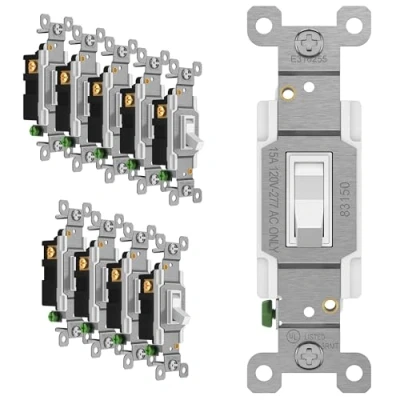 ENERLITES Toggle Light Switch, 3 Way or Single Pole, 15A 120 277V, Grounding Screw, Residential Grade, UL Listed, 83150 W 10PCS, White (10 Pack), 10 Count