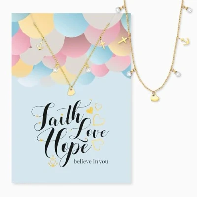 Gold Cross Heart Anchor & Beads Necklace + Faith Love Hope Card Symbolic gift for spiritual women Expression of trust, love & hope High-quality stainless steel jewellery with statement Elegant greeting card as emotional gift packaging