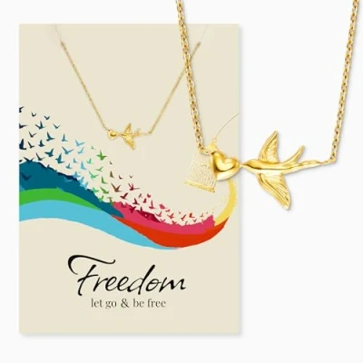 Premium Greeting Card with Gold Stainless Steel Necklace - Heart and Swallow Design Emotional gift for women for birthday, anniversary or as a small gift Jewellery and message in one: expression of freedom and love Elegant packaging with fine detail, ready for gift giving Adjustable length stainless steel chain, durable and skin-friendly