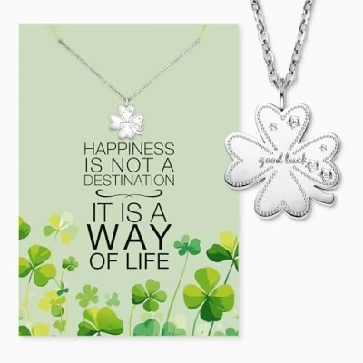 Greeting card with silver stainless steel chain and engraved clover pendant Give happiness as a gift with high-quality jewellery and emotional message Perfect gift for her: girlfriend, daughter, coworker Symbolic pendant in elegant packaging Stainless steel chain adjustable and skin-friendly