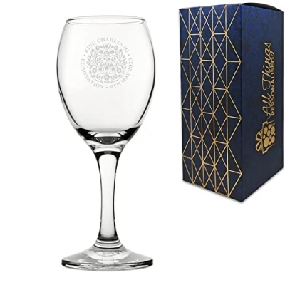 Celebrate King Charles the III and the Queen Consort's coronation with our King's Coronation Emblem White Wine Glass - perfect for remembering the regal occasion or as a gift for any royal family fan. Branded with the official Coronation Emblem, the emblem itself was created by Sir Jony Ive KBE and his creative collective LoveFrom. The emblem features St Edward's Crown formed by the flora of the four nations. This glass holds up to 310ml/11oz, and measures 191mm high x 79mm wide. A conventionally shaped wine glass, this features a tall, rounded bowl upon a slender yet sturdy stem. Marked with our laser engraving system, the King's Coronation emblem will be permanently inscribed on the glass, making a lasting keepsake to remember the coronation. Your glass will arrive with a stunning, complementary gift box. We recommend washing your glass as soon as you receive it; This glass is dishwasher safe, and as the engraving is permanent, you won't have to worry about washing off the royal emblem., Manufacturer: CNC Group