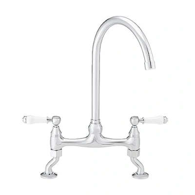 ENKI, Astbury, KT099, Deck Mounted Chrome, Kitchen Sink Mixer Tap, Featuring a Swivel Swan Neck Spout and Quarter Turn Ceramic White Levers, Solid Brass Construction, Traditional Design