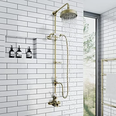 QUALITY- This shower set is premium quality, with a solid brass construction and antique brass finish. It is designed in a way that if maintenance is required, the whole valve does not require re-plumbing. The built-in anti-scald device also means no more fluctuating water temperatures while showering. Minimum water pressure required is 0.5 bar, though min. of 1.0 bar is recommended for best performance. TRADITIONAL DESIGN- This shower set is robust and graceful and will give a timeless elegance to any bathroom. It has the appearance of a classic shower tap, yet all the intricate workings of a modern shower. The shower valve has white ceramic & cross handle detailing on the antique brass valve. Shower valve - 1/2 inch hot/cold inlets with 147-153mm distance in between. SAFE TO USE- The twin thermostatic shower valve is anti-scald allowing to keep you and your family safe. The smart thermostat valve will automatically turn off the shower head if the cold water supply fails. This valve is fitted with two individual controls, one to select the showers temperature and one to control the water flow. FULL PACKAGE SHOWER SET: X1 Thermostatic twin shower mixer valve, X1 18mm rigid riser rail, X1 200mm large shower head, x1 soap dish x1 handheld showerhead, x1 hose, x1 bracket, x1 diverter, x1 installation guide. Rainfall shower head creating a powerful shower head. Showerhead also supplied with swivel joint. 10 YEAR GUARANTEE- Although our shower sets are already trusted by thousands of customers we want to provide you with true peace of mind. That's why we offer a 10 year guarantee on our shower sets., Weight: 14.4182319348 pounds, Manufacturer: ENKI