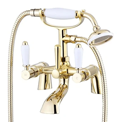 DESIGN - The Downton bath shower mixer tap from House of ENKI oozes luxury and style. With solid brass construction and finished with durable gold plating and traditional white ceramic swivel levers, it will add a touch of class to any bathroom. It is fully supplied with shower head and hose with UK standard top quality cartridges and fixings for easy assembly. This range of bathroom fittings will compliment both modern and traditional bathroom interiors. QUALITY - Our bath mixer taps are made of solid brass. Complete with drip-free quarter-turn ceramic valves, our bath taps are easy and safe to use with cold water and hot water and will work on high pressure water systems. SIZE - Distance between pillars - 180mm, Connection size - 3/4" EASY TO INSTALL - These bathroom accessories come with all fittings to be installed straight out of the box and include comprehensive installation guides. For these water taps to operate efficiently, your water system will need to produce at least 0.5 bar of pressure, though we recommend 1.0 bar for best performance. 10 YEAR GUARANTEE - Although our bathroom accessories are already trusted by thousands of customers, we want to provide you with true peace of mind. That�s why we offer a 10 year guarantee on our bathroom taps fittings., Manufacturer: ENKI