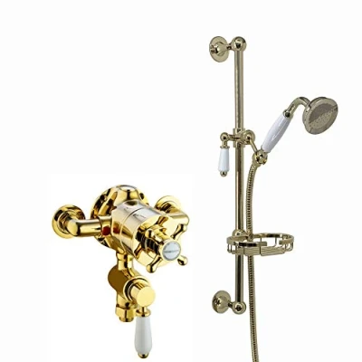 ENKI, Downton, SH0556, Exposed Traditional Thermostatic Shower Set Incl. Twin Valve and Slider Rail Kit, Soap Basket, Gold