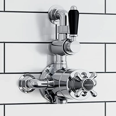 ENKI, Downton, T100, Traditional Thermostatic Shower Valve with Return to Wall Bend, Semi Concealed Valve, Chrome and Black