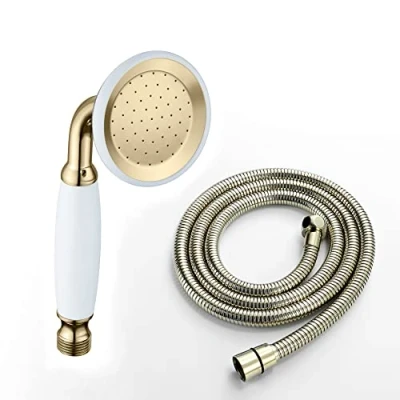 DESIGN - This traditional style handheld shower head and shower hose set from House of ENKI comes in a beautiful English gold finish and is complete with a classic white porcelain handle to add that touch of class to your bathroom. Our range of high quality, affordable fixed shower heads are designed to look great and are suitable for family bathrooms and shower rooms QUALITY - House of ENKI shower heads are made of solid brass and shower hoses are stainless steel, all with high quality durable finishes to compliment modern or traditional bathroom interiors. The classic round head shower kit comes with a flexible shower hose and is easy to clean thanks to its anti-clog nozzles SIZE - Connection size is UK Standard 1/5 inch. Shower hose: 150cm EASY TO INSTALL - Our shower head and shower hose set comes with all fittings to be installed straight out of the box 1 YEAR GUARANTEE - Although our bathroom accessories are already trusted by thousands of customers, we want to provide you with true peace of mind. That�s why we offer a 1 year guarantee on our bathroom shower heads and fittings, Weight: 1.1464037624 pounds, Manufacturer: ENKI