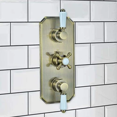 ENKI, Regent, TSV044, Antique Brass Triple Concealed Thermostatic Mixer Tap Valve with Two Outlets for Bathrooms, Traditional Victorian Style