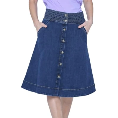✅ Comfort Stretch Denim – Made from a premium blend of cotton, polyester, and elastane, this women’s blue denim A-line skirt ensures flexibility, breathability, and all-day comfort, making it a perfect choice for work, travel, or casual outings. ✅ Chic Horn Button Detail – Designed with stylish horn button accents, this midi denim skirt adds a sophisticated touch to your wardrobe, making it easy to dress up for smart-casual events or keep simple for everyday wear. ✅ Flattering A-Line Cut – The regular fit A-line silhouette flatters every body type while offering freedom of movement, making this ladies’ high waist denim skirt both versatile and figure-enhancing for all occasions. ✅ Classic Blue Denim Wash – Featuring a timeless deep blue denim wash, this skirt pairs effortlessly with blouses, t-shirts, or sweaters, giving you endless styling options for spring, summer, autumn, or even layered winter looks. ✅ Everyday Wardrobe Essential – With its midi length and versatile design, this women’s denim midi skirt transitions seamlessly from office wear to weekend outfits, offering a stylish and reliable piece for modern fashion collections.