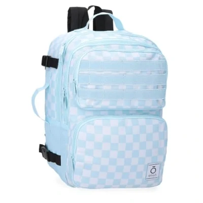 Cabin backpack 28cm x 40cm x 20cm made of polyester ideal as hand luggage. Main compartment with a practical interior of two compartments, one with zip closure and the other with elastic straps inside. Front compartment with pocket and interior organizer for storing gadgets or personal belongings. Wide, ergonomic padded shoulder straps fit perfectly on the back and back strap to incorporate it into the trolley when travelling.