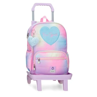 Backpack 30 cm x 38 cm x 12 cm made of polyester. Large capacity main compartment for books, notebooks or carry all personal accessories for travel. Two front pockets and two side pockets to carry accessories and gadgets. It incorporates a trolley with silicone wheels and Magic Fix system to achieve greater attachment of the backpack to the trolley. It can be easily removed if you prefer to wear it on your back. Includes decorative pom pom