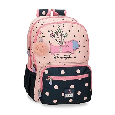 Backpack 32 cm x 44 cm x 17 cm made of polyester. Double main compartment with audio output and inner pocket for MP3 player or mobile phone. Two front pockets, one with interior organizer for small accessories and three pens. Wide, ergonomic and padded shoulder straps that adapt perfectly to the back, back strap and possibility of retracting a trolley thanks to the Magic Fix system for a better hold of the backpack on the trolley Pompom keyring that complements the design.