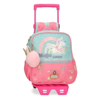 Backpack 23 cm x 25 cm x 10 cm made of polyester. Main compartment with the ideal size to store essential things for school or personal belongings when you go on the go. Front zip pocket for easy access to smaller personal belongings. Two side pockets for storing small accessories or bottles. It incorporates a trolley with silicone wheels and Magic Fix system to achieve greater attachment of the backpack to the trolley. It can be easily removed if you prefer to wear it on your back. Includes decorative pom pom