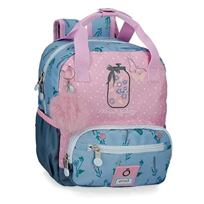 Backpack 23 cm x 28 cm x 10 cm made of polyester. Main compartment with the ideal size for storing essentials for school or personal items when you are on the go. Two front pockets and two side pockets for accessories and gadgets. Wide, ergonomically shaped and padded shoulder straps adapt perfectly to the back and can optionally allow additional support of the backpack on the trolley with the back strap and the Magic Fix system. Pompom keyring that complements the design.