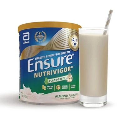 Ensure NutriVigor Plant Protein Shake 400 g Almond Flavour Support Strength, Energy and Immunity Food supplement With Protein,27 Vitamins Minerals Vitamin D, C B