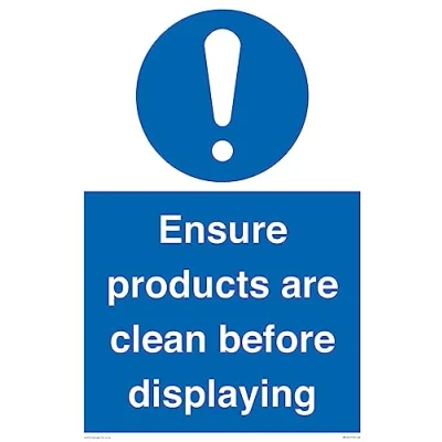 M001 : General mandatory action This sign is made from vinyl / sticker Air Release vinyl makes it easy to stick to flat, clean surfaces without bubbles. Not for rough, plastic or dusty surfaces. A2 portrait Sign Text: Ensure products are clean before displaying