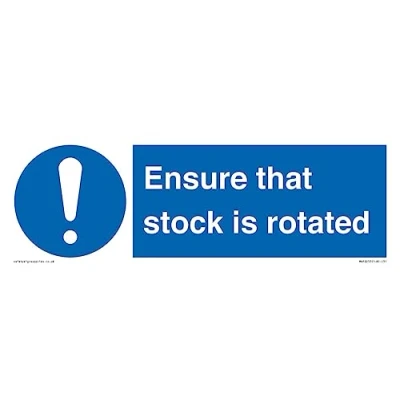 M001 : General mandatory action This sign is made from vinyl high tack A stickier sticker. Uses a stronger adhesive to make it more suitable for plastic surfaces like Wheelie Bins or where the sticker might get rubbed. 31 Sign Text: Ensure that stock is rotated