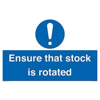 M001 : General mandatory action This sign is made from vinyl high tack A stickier sticker. Uses a stronger adhesive to make it more suitable for plastic surfaces like Wheelie Bins or where the sticker might get rubbed. A2 landscape Sign Text: Ensure that stock is rotated
