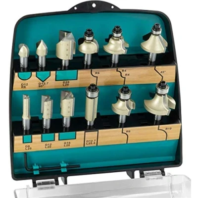 This ENT router bit set offers you a selection of 12 different router bits from seven different router bit categories. The multi-purpose wood router bit set is very popular with DIY enthusiasts and craftsmen, as a worktop router bit set as well as on installations, thanks to its proven durability. Special features - The PLUS edition offers you four straight router bits (Ø 8mm, 12mm, 16mm, 20mm), each with a carbide basic tip (Z2+1) and a depth scale up to 20mm, for drilling and plunging into softwood and hardwood. The golden anti-stick coating ensures better chip ejection, reduces the effort required as well as reducing resin and glue build-up. ENT quality - Each router bit has a fine-grained carbide cutting edge, a long service life and is durable and wear-resistant. Router bits with high-quality ball bearings glide along your workpiece to create clean and smooth surfaces on furniture such as tables, shelves and window frames. Some router bits have an axle angle for a tear-free cut. Compatibility - The 8 mm shank diameter fits all hand routers, bench routers and CNC machines of all power tool brands with 8 mm collet. The precisely ground shank ensures an optimum hold in your machine and enables high concentricity. Important useful data such as minimum clamping depth and maximum speed can be found on the respective shank. Delivery includes - 4x straight router bits (Ø 8mm, 12mm, 16mm, 20mm) with TC drilling tip Z2+1, usable length 20 mm / 1x flush trim router bit with 12.7 mm, usable length 25.4 mm / 2x roundover router bit, radius 6 and 10 / 1x chamfer bit Ø 12mm, radius 6 / 1x chamfer router bit, radius 6 / 1x v groove router bit angle 90° / 1x edge forming router bit radius 4 / 1x chamfer router bit with 45° / 1x hex key