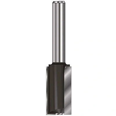 Shank (S) 8 mm, Shank length (SL) 32 mm Diameter (D) 10 mm, Cutting width (NL) 30 mm Total length (GL) 62 mm Flutes (Z) 2+1, with TC Centre Tip and solid carbide cutting part soldered into shank. Straight cutter with two flutes for clean finish. For grooving, rebating and mortising. With TC centre tip. The TC centre tip is ideal for plunging and working in abrasive materials such as chipboard, MDF, plywood and hardwood.