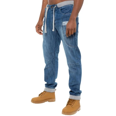 AmazonEnzo Mens Elasticated Waist Cuffed Jeans 2 Back Pockets, 2 Front Pockets, 1 Coin Pocket Adjustable Drawstring For Added Comfort Contrast Stitch Detailing Available In Black Blue, Dark Stonewash & Light Stonewash, Navy and Black Coated