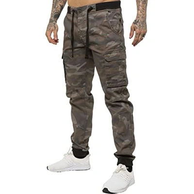 AmazonEnzo Mens Camo Combat Cuffed Jogger Style Trousers 6 Pockets including velcro side pockets and buttoned back pockets Mid rise , Zip Fly Fastening Mid Rise, Elasticated Ribbed Waist and Cuffs Elasticated Waist with Drawcord and Secured by Button