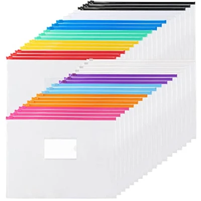 PACKAGE CONTAINS: 36pcs plastic envelopes in 11 colors (3 red, 3 yellow, 3 blue, 3 green, 3 white, 3 black, 3 sky blue, 3 violet, 4 Orange, 4 rose red, 4 transparent). Poly zip envelopes have a bag for labels, which makes it easy to distinguish documents, conduct topic induction and others what you want to assort. PRODUCT SIZE: 33 x 24cm / 13 x 9.5inch, letter size / A4 size. Can meet your storage needs for a large number of files. MATERIALS: Our Poly Zip Envelope is made of quality PVC plastic. The zipper head is made of plastic, which is very smooth to use and not easy to damage. It can protect the documents or articles stored in it from wrinkling or getting olg. PRODUCT FEATURES: Our products are in 11 different colors, can not only add color to your desk, but also making it convenient to store different types of materials in different colors, more conducive to organization and storage. The quality PVC plastic surface also protects the file from damage. PRODUCT USE: Poly Zip Envelope can be used for file storage in homes, schools, college, offices, etc., and can also be used to store your personal belongings. A transparent surface allows you to find the files or items you want to find more quickly.