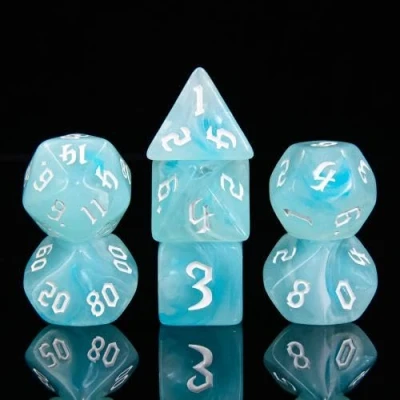 Set of dice contained in their plastic box. Coloured dice set blue and white. Set of dice in various shapes. Set of dice D2, D4, D6, D8, D10, D12 and D20. This set of dice will brighten up your board game evenings., Manufacturer: Ludistri