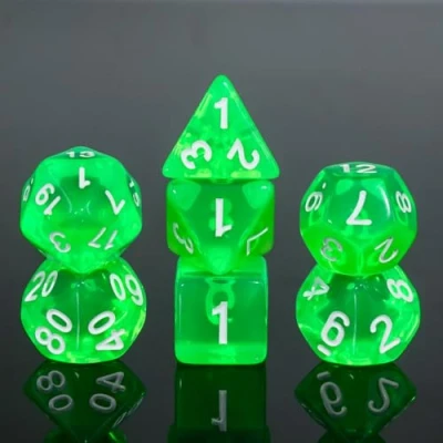 The dice are magnificent when exposed to light. D4 16 mm D6 16 mm D8 16 mm D10 16 mm D00 16 mm D12 18 mm D20 20 mm Durable and damage resistant Can be used for different types of board games and various situations. Set of 7 Polyhedral Dice: green color, Manufacturer: Ludistri