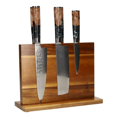 Take advantage of this razor-sharp combination deal and benefit from a large discount! This combi deal contains a 6-piece knife set from the Epoxy Onyx Series + a magnetic knife block that is magnetic on both sides . This combination is a real eye-catcher in the kitchen and ensures that your new favorite knives are stored in a stylish way. This acacia wood knife block comes with 6 knives from the Epoxy Onyx series that are suitable for various cutting tasks in the kitchen. The combination of unique epoxy handles and an acacia wood knife block makes it truly a work of art. The set consists of: 1x Epoxy Onyx Series - 6-piece knife set * 67 layers of VG-10 damask steel * Hardened to 61 HRC Rockwell 1x Magnetic knife block acacia wood double sided * Durable and strong * Firm * Practical and elegant The prices mentioned are inclusive €40 discount. Epoxy Onyx Series from Shinrai are unique for every kitchen. With this beautiful knife set you always have the right knife at hand. This edition of the Epoxy Onyx Series is finished to perfection. The damask steel blade continues in a beautiful epoxy onyx bolster. One half of the handle is made of European oak. The European oak flows into the beautiful black onyx epoxy. All this is finished with 1 gold and 2 black rings at the handle of the knife. Each handle is different and is truly a work of art in itself. * Complete knife set that you can enjoy for at least 30 years. * 67 layers of VG-10 damask steel * Hardened to 61 HRC Rockwell * Razor-sharp 6-piece knife set * Comes in a luxury gift box * The best in its price range Comfortable All blades are extremely sharp. Due to the perfect balance, they lie comfortably in your hand. Cutting food has never been so easy and fun! Handmade in detail Because the knives are handmade, attention has been paid to every detail during production. This way you get the best quality knives. Perfect grip The damask steel blade continues in a beautiful epoxy onyx bolster. One half of the handle is made of European oak. The European oak flows into the beautiful black onyx epoxy. All this is finished with 1 gold and 2 black rings at the handle of the knife. Each handle is different and is truly a work of art in itself. This creates the perfect grip. A beautiful gift The knives are always delivered in a beautiful gift box. This not only ensures that the blades are protected on the go, but also that it puts a smile on your face when you receive it. VG10 67 layers damask steel Shinrai knives are unique as most of them are handmade. Both sides of the knife consist of 33 layers of the best steel. These layers are placed against a layer of VG10 steel, giving you a knife of 67 layers. This is also called Damask steel. The production technique is centuries old and results in stronger and harder knives. This makes the knives indispensable for every kitchen. Buy the entire knife set today and benefit from an extra discount and free shipping!