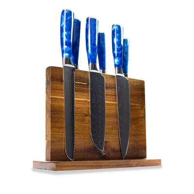 Take advantage of this razor-sharp combination deal and benefit from a large discount! This combination deal contains a 6-piece knife set from the Epoxy Sapphire Series + a magnetic knife block that is magnetic on both sides. This combination is a real eye-catcher in the kitchen and ensures that your new favorite knives are stored in a stylish way. This acacia wood knife block comes with 6 knives from the Epoxy Sapphire series that are suitable for various cutting tasks in the kitchen. The combination of unique epoxy handles and an acacia wood knife block makes it truly a work of art. The set consists of: 1x Epoxy Sapphire Damascus Print Series - 6 Piece Knife Set * High quality high carbon steel * Beautiful damask print on the blade 1x Magnetic knife block acacia wood double sided * Durable and strong * Firm * Practical and elegant The prices mentioned are inclusive €40 discount . Beautiful and unique Shinrai knife set. All knives you need in 1 set! The Damascus Print Series knife set consists of a chef's knife (20 cm), a santoku knife (18 cm), a nakiri knife (18 cm), a bread knife (20 cm), an office knife (13 cm), and a paring knife (9 cm). People who cut a lot probably suffer from it sometimes. Knives that become blunt very quickly and blades where the cut food always sticks to the knife. This is a thing of the past with this razor-sharp knife set from Shinrai. The hand-crafted steel blade continues into a beautiful Epoxy Sapphire handle. Shinrai knives are unique as most of them are handmade. Forged from High Carbon steel, making the blades hard and very sharp. A beautiful and durable knife set that cannot be missing in your kitchen. * Made of high carbon steel * Hardened to 60 HRC Rockwell * Razor-sharp 6-piece knife set * Comes in a luxury gift box * The best in its price range Comfortable All blades are extremely sharp. Due to the perfect balance, they lie comfortably in your hand. Cutting food has never been so much fun! Handmade in detail Because the knives are handmade, every time we can look closely at every detail. This way you get the best quality knives. Perfect grip The handles consist of high quality Epoxy Sapphire. The epoxy creates a nice effect on the handle. Each handle is different and in reality the handles are even more beautiful than on the pictures. The handles lie well in the hand and provide a nice grip when cooking. A second advantage of the blade is the crop. This does not extend all the way to the edge, but it clearly separates the handle from the blade. This provides extra safety while cutting, which is nice! A beautiful gift The knives are always delivered in a beautiful gift box. This not only ensures that the blades are protected on the go, but also that it puts a smile on your face when you receive it.