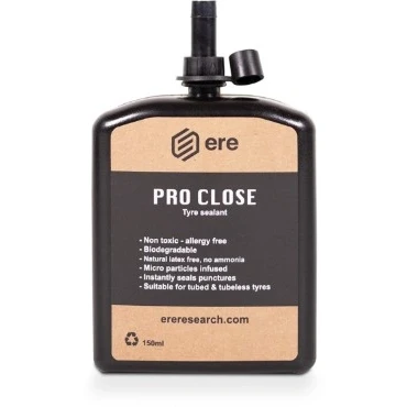 Making tires tubeless can be a complicated, lengthy, and messy affair. Often additional tools are required. With ProClose Sealant from Ere Research, messing around is a thing of the past.Pro Close instantly seals leaks with the help of particulates and contains no latex. This makes the sealant allergy-free. Ere Research has provided the bottles with a handy filler cap and includes a valve core remover so that the tire can be filled with the Pro Close Sealant without additional tools. So, no more messing with hoses or syringes.ProClose is not only very user-friendly but also biodegradable. That makes Pro Close Sealant an eco-friendly solution for tubeless cycling. By using non-toxic volatiles, the sealant has a longer shelf life – a minimum of 26 months in the bottle and 2 to 3 months in the band. ProClose Sealant can be used in inner tubes and tubeless tires, such as the Tubeless Ready tires from Ere Research.Specifications Ere Research ProClose SealantAvailable sizes: 80, 150, 250 and 500 mlNon-toxicEco-friendlyZero ammoniaZero Natural Latex (Hypoallergenic)Compatible with all alloy, steel and composite wheel rimsDoes not freeze or boil (Tested to -17C and +45C)Suitable for Tubed, Tubular, TubelessExtended shelf life (26+ months)Permitted for shipping by post or air freight