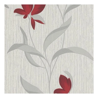ManoManoGeneral description A classic floral design is displayed by this stunning wallpaper from Erismann. Lovely glitter features are also presented in selected areas, adding an extra sense of style and luxury. Complimented by a white, red, and silver colorway, this wallpaper creates a perfect platform for elegance in any home. Technical specifications Roll size: 10.05m x 0.53m Pattern repeat: 64/32cm