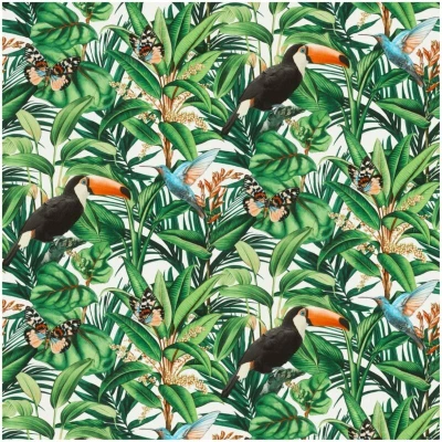 General description This breathtaking vinyl wallpaper invites the vibrant energy of a lush tropical paradise directly into your home, creating an exhilarating and immersive visual experience. The design features oversized, verdant green palm fronds and various tropical leaves, meticulously detailed to capture their natural textures and rich coloration. Nestled among this abundant foliage are striking toucans with their distinctive bright orange beaks, elegantly poised hummingbirds in iridescent blues, and graceful butterflies with detailed wings in warm earthy and orange tones. These captivating creatures are rendered with lively accuracy, bringing a sense of movement and exotic life to your walls. The crisp, clean white background dramatically highlights the vivid greens of the leaves and the brilliant colors of the birds and butterflies, ensuring that each element pops with stunning clarity. This bold and adventurous pattern is perfect for creating an eye-catching feature wall or