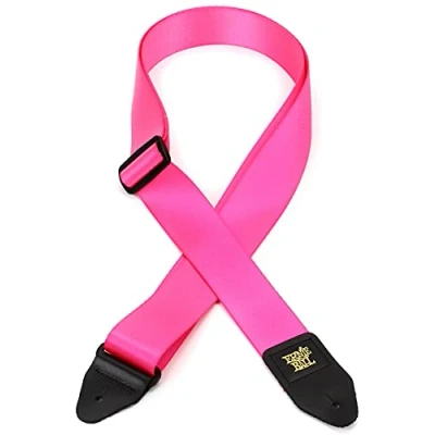Adjustable length 41 Inch to 72 Inch. Comfortable width at 2 inches wide. Strong and durable neon pink polyester webbing. Premium leather ends. Ernie Ball logo stamped in gold print.