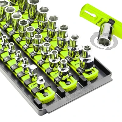Universal twist-lock socket set organizer tray with 3 socket rails Perfect for storage in the drawer, on the bench, or on the go: holds 40 sockets Twist-Lock clips keep sockets secured for transport and prevent tool loss. Sockets are loaded with the drive end down. Includes 40 Twist Lock Clips; 15 - 1/4", 14 - 3/8" and 11 - 1/2" drive size. Socket rails are locked in the tray for security and unlock with the push of a button Includes I.D. stickers for socket identification, Manufacturer: Ernst Manufacturing, Inc.