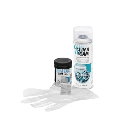 Kit for CLEANING INDOOR UNITS of A/C SYSTEMS or HEAT PUMPS, A/C CONDENSATE DRAINS and TRAYS The kit contains: 1 FOAMING CLEANER for AIR CONDITIONERS, 40 long-lasting TABS to keep the efficiency and cleanliness of the AIR CONDITIONER and CONDENSATE DRAIN, disposable GLOVES Clima Foam: foaming cleaner for air conditioners; the foam captures and removes stubborn dirt and hard-to-reach grime Clima Tabs: 40 TABS for keeping the EFFICIENCY and CLEANLINESS of the AIR CONDITIONER and CONDENSATE DRAIN; REMOVE and PREVENT the formation of algae, slime, sludge, and BAD ODOURS; LONG-LASTING EFFECT: place 5 evenly spaced tabs into the split unit after each cleaning, replace every 30 days if dissolved IMPROVES THE EFFICIENCY of A/C systems and reduces their energy consumption; ensures the long-term hygiene of the air conditioner ELIMINATES BAD ODOURS due to contaminants and RESTORES THE INDOOR AIR QUALITY READY TO USE Disposable gloves included in the package