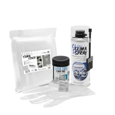 Kit for CLEANING INDOOR UNITS of A/C SYSTEMS or HEAT PUMPS, A/C CONDENSATE DRAINS and TRAYS. Includes UNIVERSAL CLEANING COVER BAG for A/C indoor units The kit contains: 1 AIR CONDITIONER CLEANER with HARD BRISTLE DISPENSER BRUSH, designed for direct use on A/C coils, 1 UNIVERSAL CLEANING COVER BAG for A/C indoor units, 40 long-lasting TABS to keep the efficiency and cleanliness of the AIR CONDITIONER and CONDENSATE DRAIN, disposable GLOVES Clima Cover: CLEANING COVER BAG for A/C INDOOR UNITS suitable for any air conditioner model. It includes an adjustable drawstring for convenience and is reusable. It protects surfaces and walls around wall-mounted units during the cleaning process and conveys all dirt into a bucket through the drain outlet pipe. Clima Spray PRO: air conditioner cleaner with hard bristle dispenser brush; increases the cleaning power of the cleaner through the mechanical action of the special dispenser brush on A/C coils; removes dust, allergens, microorganisms and even the most stubborn dirt Clima Tabs: 40 TABS for keeping the EFFICIENCY and CLEANLINESS of the AIR CONDITIONER and CONDENSATE DRAIN; REMOVE and PREVENT the formation of algae, slime, sludge, and BAD ODOURS; LONG-LASTING EFFECT: place 5 evenly spaced tabs into the split unit after each cleaning, replace every 30 days if dissolved IMPROVES THE EFFICIENCY of A/C systems and reduces their energy consumption; ensures the long-term hygiene of the air conditioner ELIMINATES BAD ODOURS due to contaminants and RESTORES THE INDOOR AIR QUALITY READY TO USE Disposable gloves included in the package, Weight: 2.425084882 pounds, Manufacturer: ERRECOM