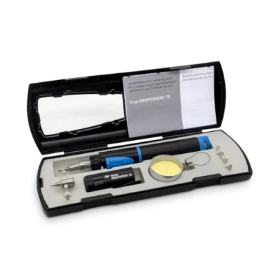 With its infinitely variable power rating from 15 up to 75 watts (compared with electrical soldering irons) max. soldering tip temperatures of 500°C can be achieved The Independent 75 operates on commercially available butane lighter gas The Independent 75 "Basic Set" is supplied in a practical transport case, consisting of a gas soldering iron with pre-installed catalytic soldering tip, a spare tip and a sponge container with cleaning sponge