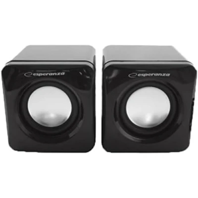 Esperanza Multimedia Stereo Speakers 2.0 for PC. Easy to connect to USB and AUX audio input of computer/laptop/console, etc. Plug and play sounds immediately. Ready to use Elegant design, stable and sturdy construction, practical and lightweight. With the Leggiero Cube from Esperanza you get natural and pure sounds at a fantastic price Volume control (louder/quieter) directly on the speaker. Rich sounds thanks to the built-in amplifier. Convincing performance and a fantastic look Technical specifications: total effective power: 2 x 3 W. Impedance: 4 ohms. Frequency range: 60-20000Hz Power supply: 5V via USB port. Audio input and output: 3.5mm aux port Also discover the Esperanza headset range and look for the SHERZO, CONCERTO, BLUES, TECHNO or YOGA Bluetooth headphones.