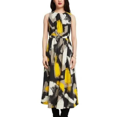 The sleeveless dress made from a cotton mix presents itself with an eye-catching graphic print and subtle ruffle pleats on the neckline. Cotton mix Rounded neckline Elasticated waist Fit and flare design